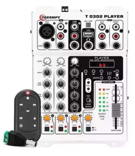 A T 0302 Player é a primeira “Mesa Player” da Taramps. Além de controlar e mixar o seu sistema de som, ela é capaz de reproduzir sua playlist favorita sem a necessidade de usar um “player convencional”. O Player integrado, possui conexão Bluetooth, entrada USB, recepção de FM e saída para fones de ouvido. E para ficar ainda melhor, incluímos o controle remoto de longa distância, que permite aumentar ou diminuir o volume, trocar faixas e pastas, entre outras funções, quando utilizada a função Player.